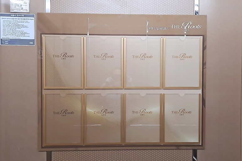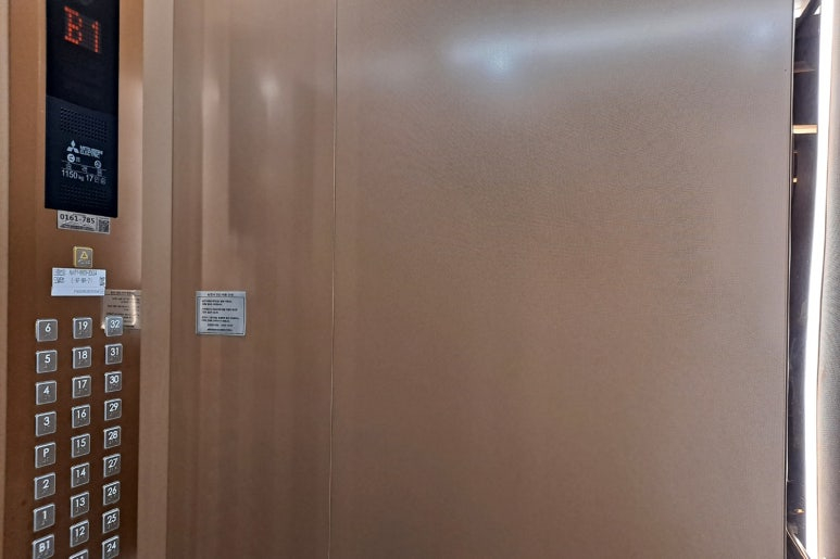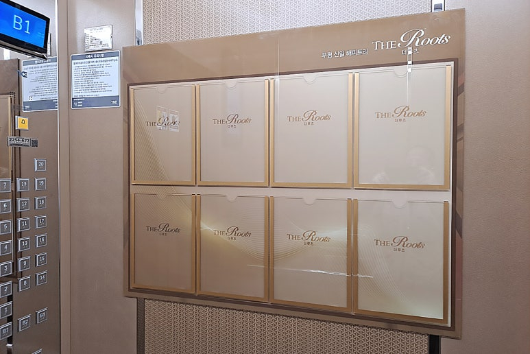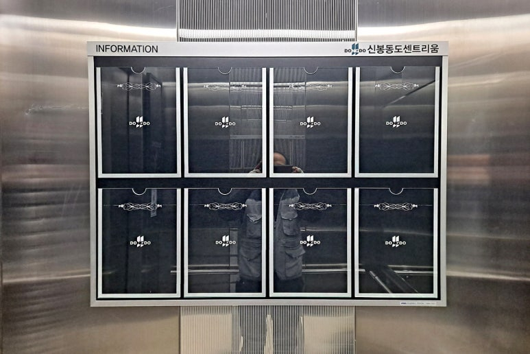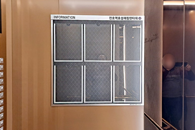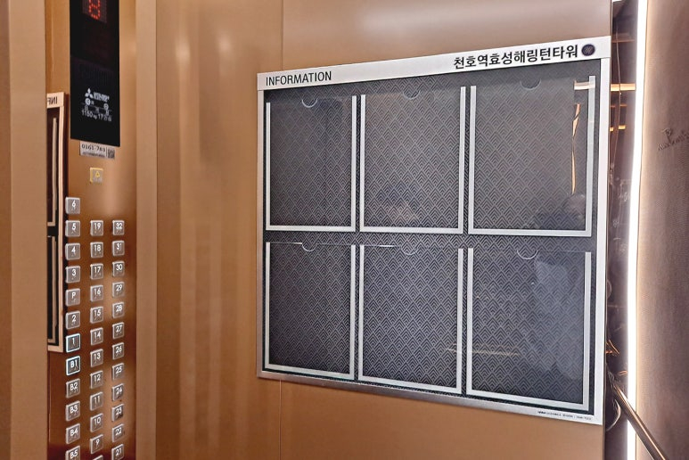 엘리베이터의 빈 벽면을 활용하여 고급스러운 실버 메탈 몰딩으로 제작된 슬림 디자인 게시판을 시공했는데요!