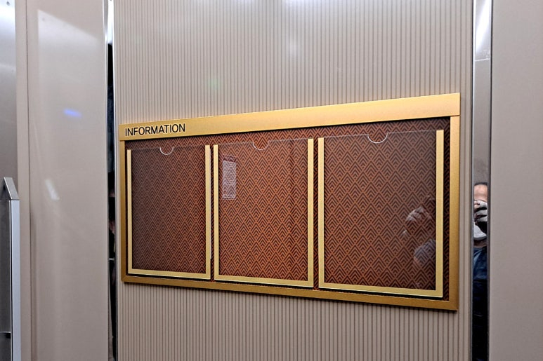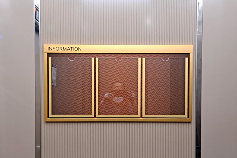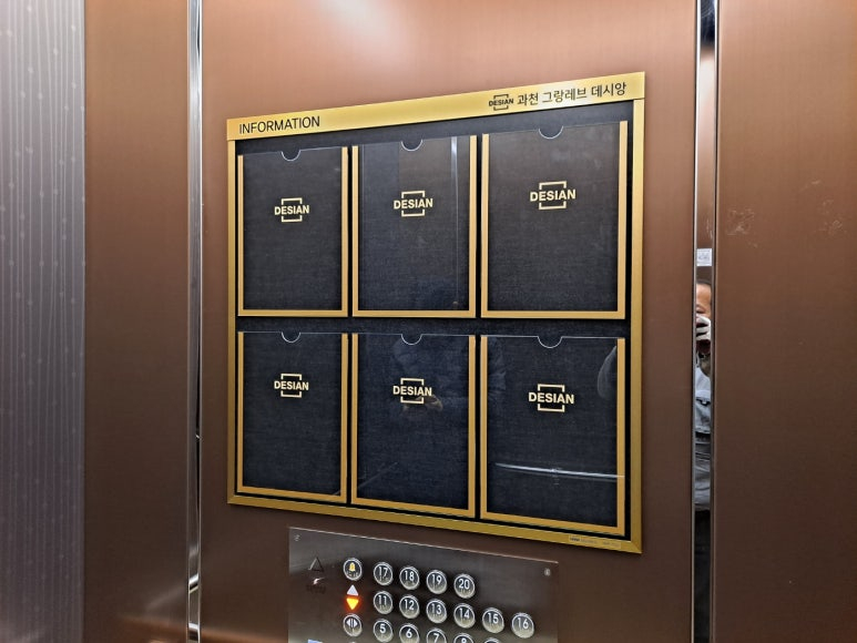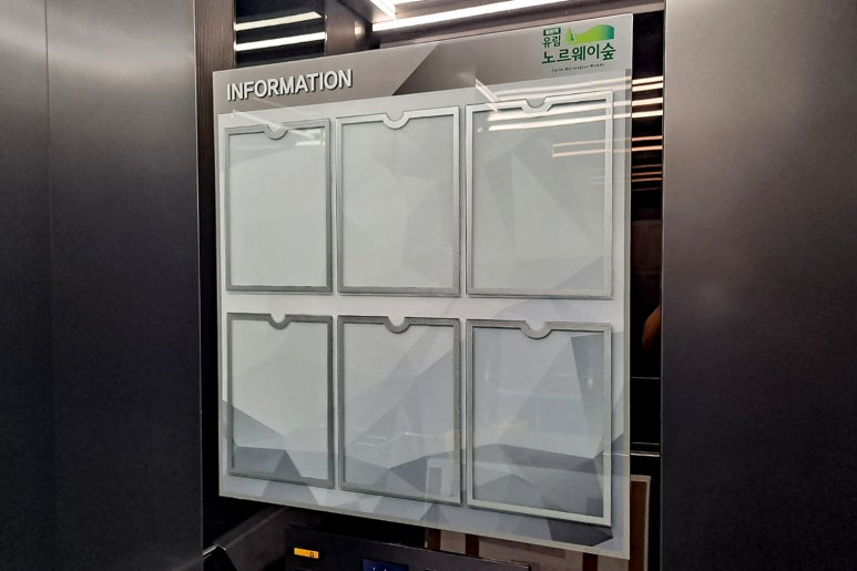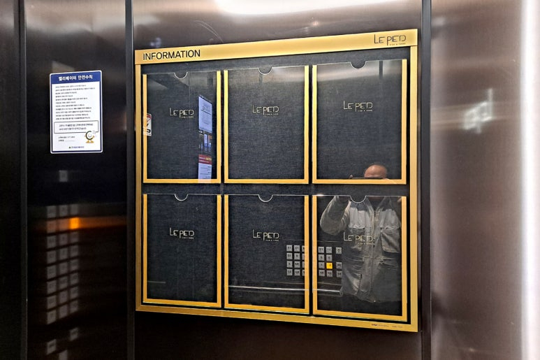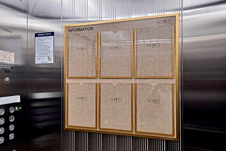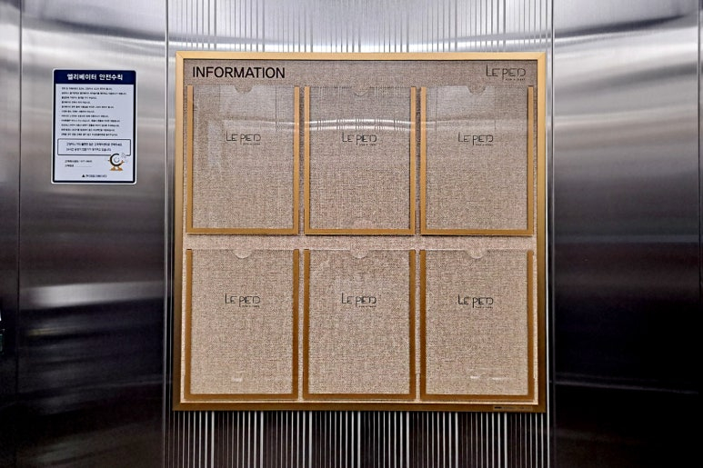엘리베이터의 빈 벽면을 활용하여 고급스러운 실버 메탈 몰딩으로 제작된 슬림 디자인 게시판을 시공했는데요!