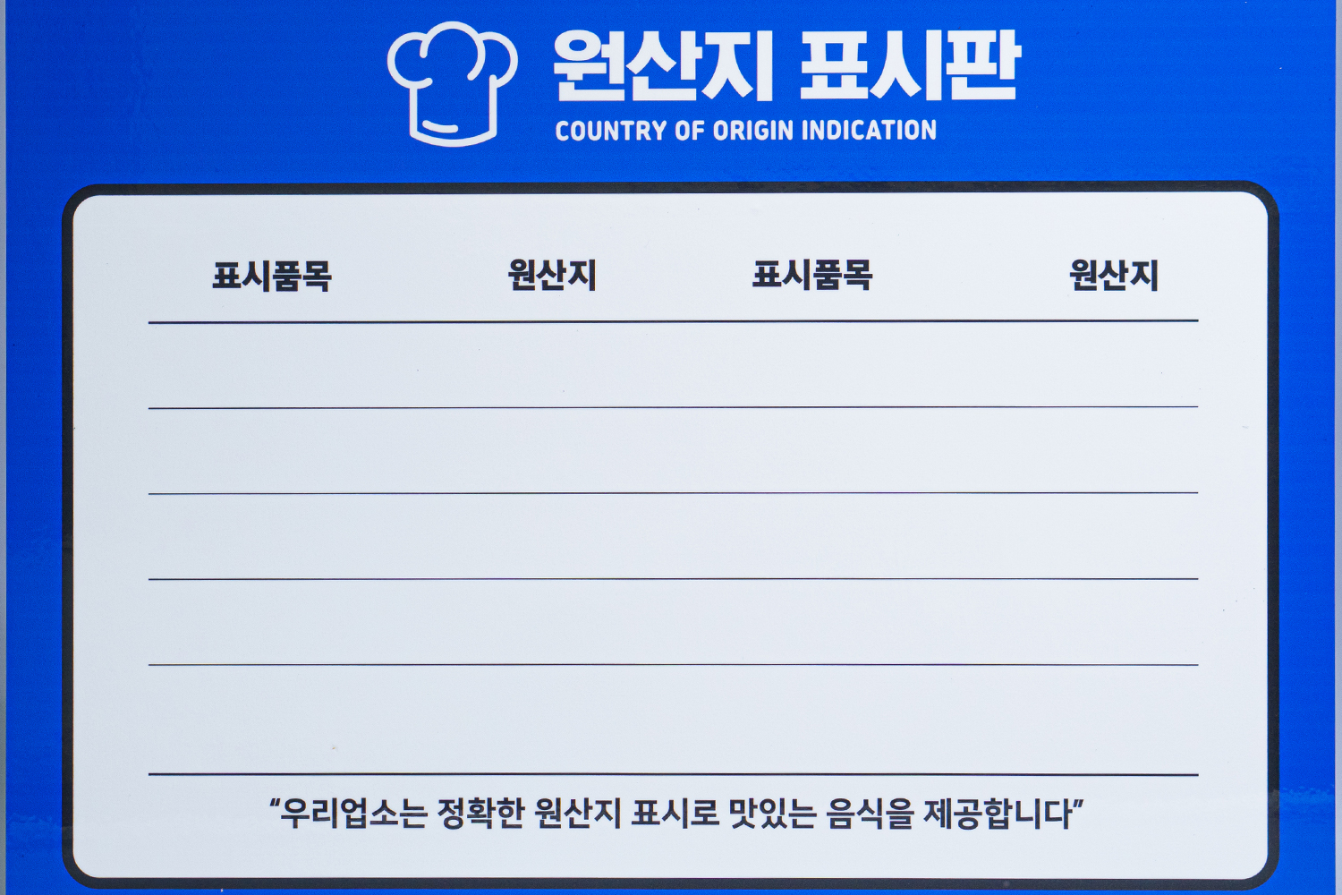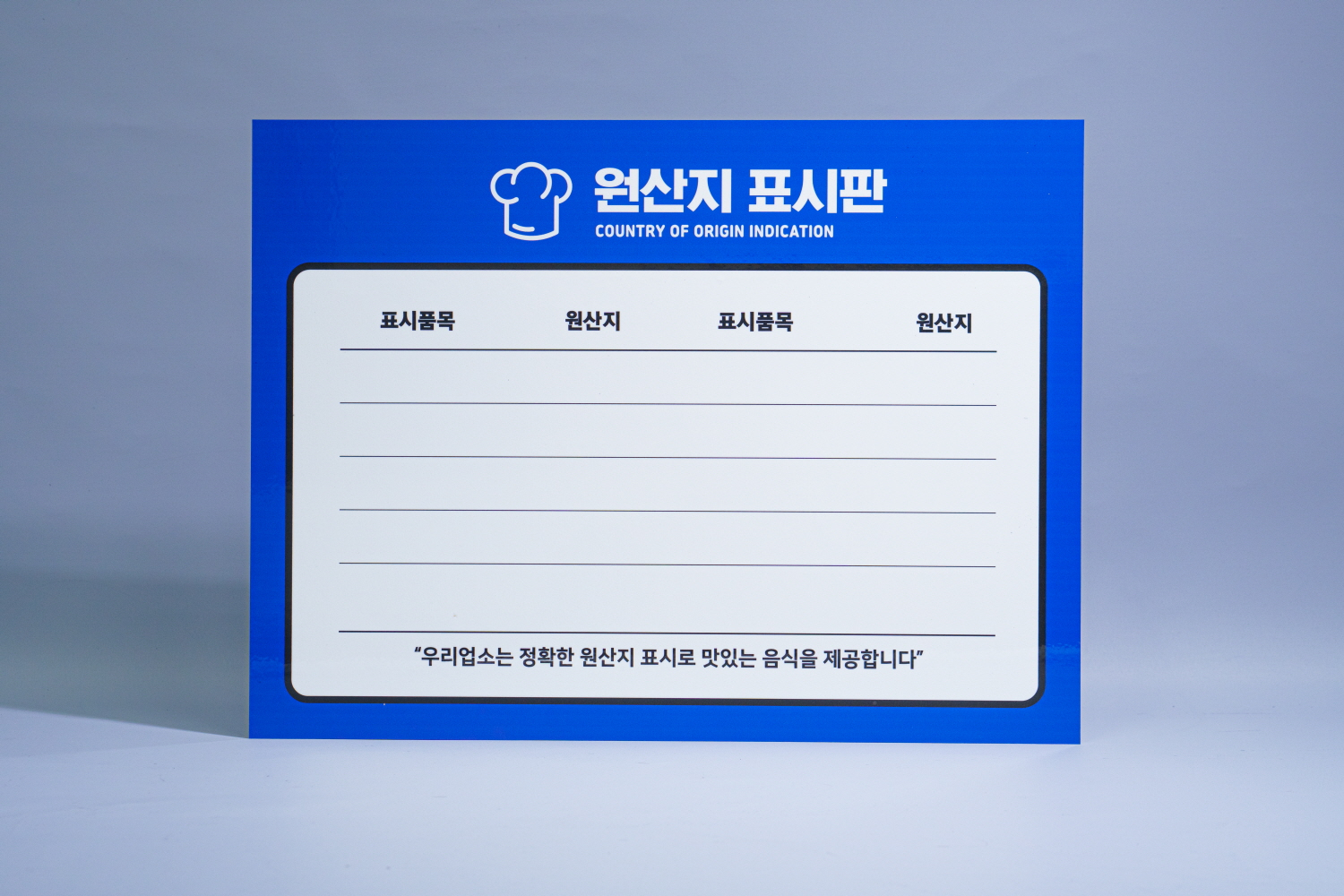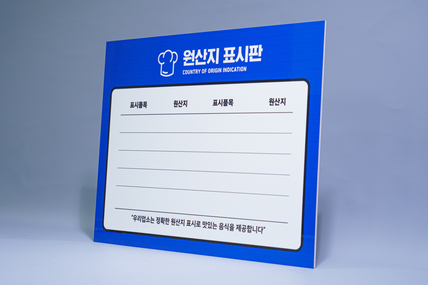 원산지 표시판은 상가, 호텔, 회사, 공공기관 등의 식당 시설에 원산지를 표시하기 위에 제작된 상품입니다.
