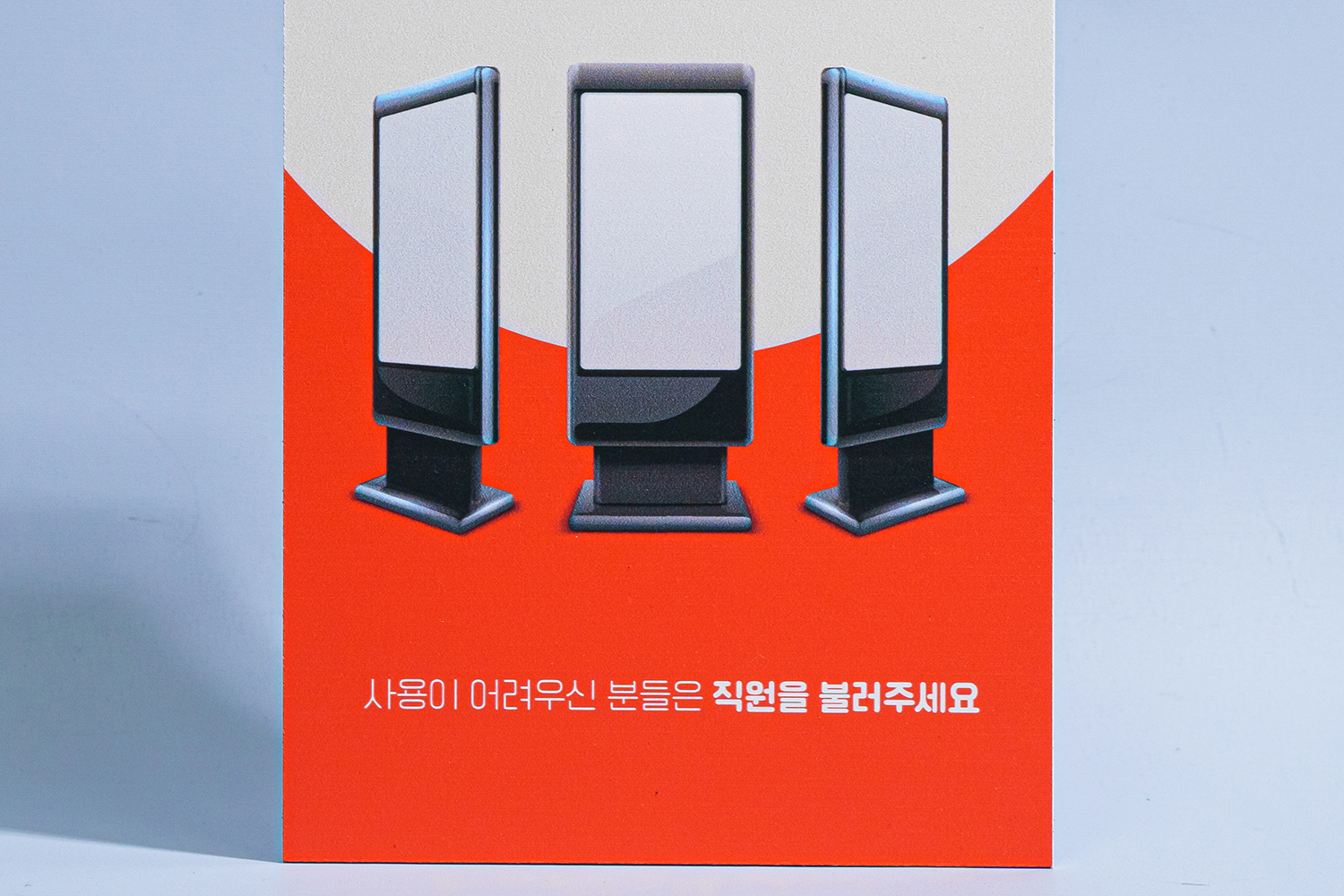 키오스크 결제, 환경부담금, 원산지 표시, 셀프코너, 주문번호 확인 안내판 을 보여드렸습니다.
