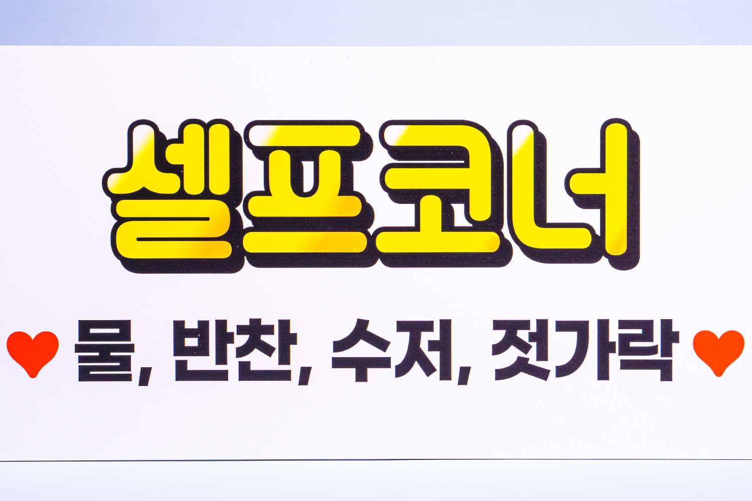 물, 반찬, 수저, 젓가락 은 셀프로 가져가야 하는 것을 알리는 안내판 입니다.