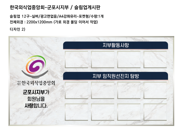 슬림업 12구 게시판으로 제작하여 시공을 진행하였습니다~!