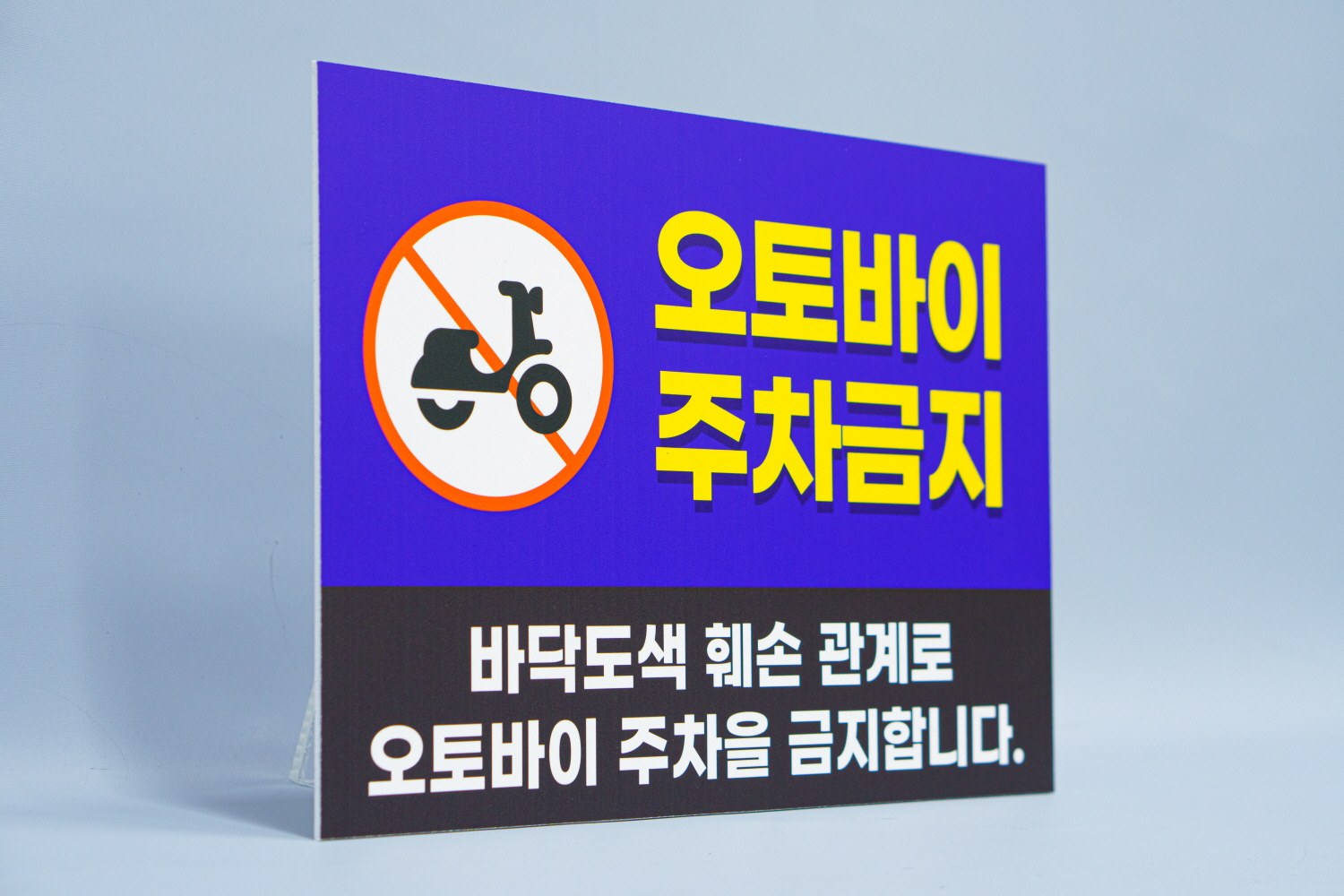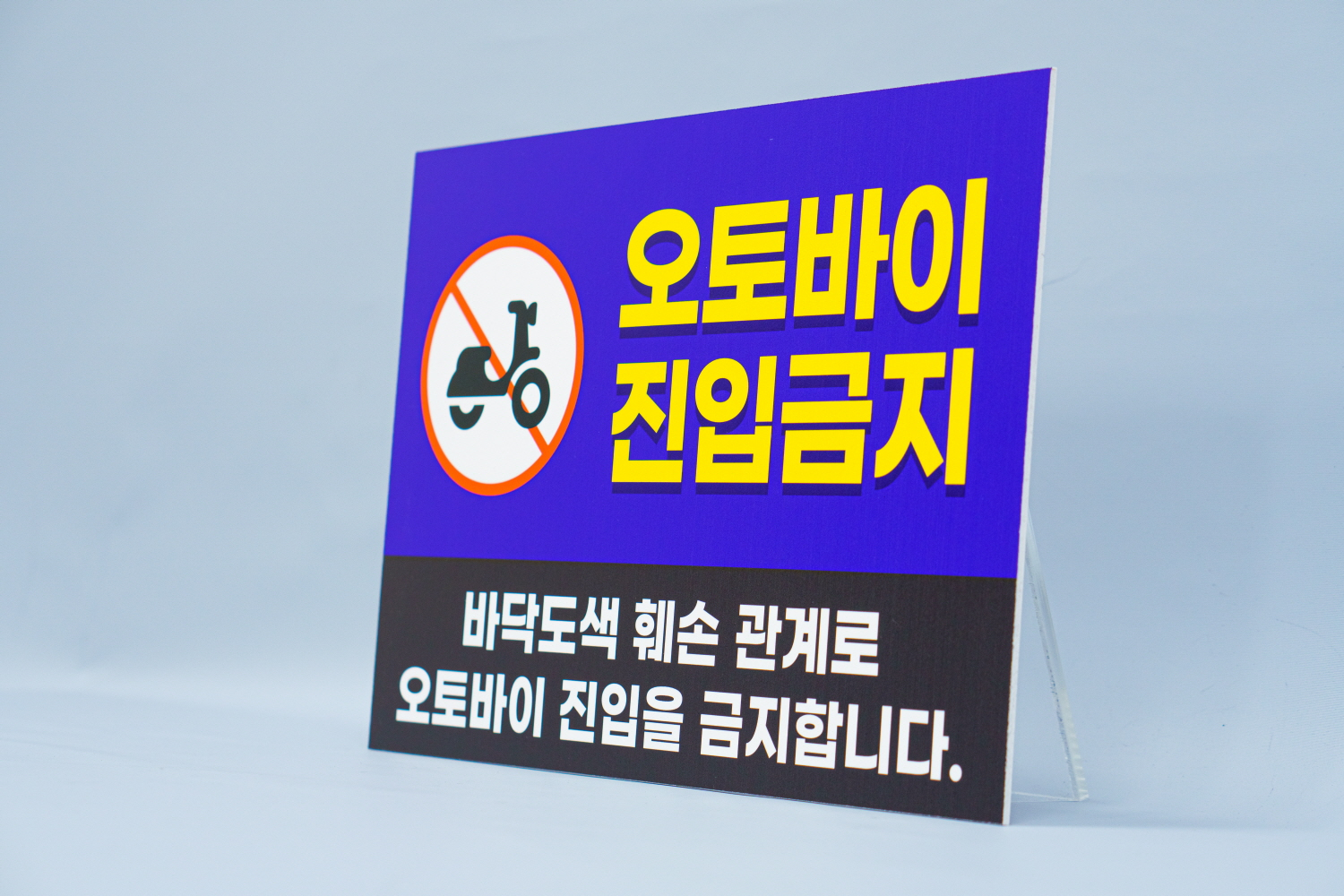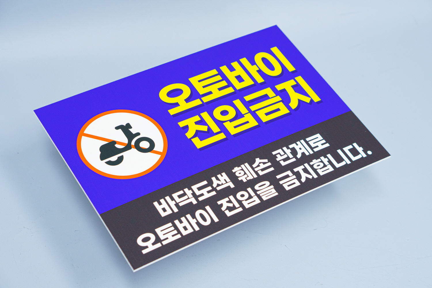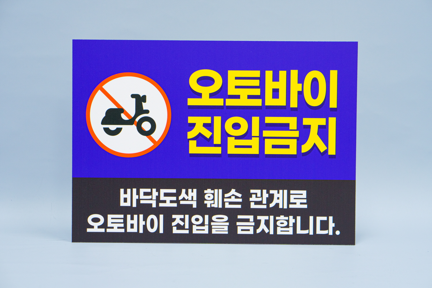 해당 안내판은 바닥도색 훼손을 막기위해 오토바이 진입 및 주차를 금지하기 위해 제작된 안내판 입니다.