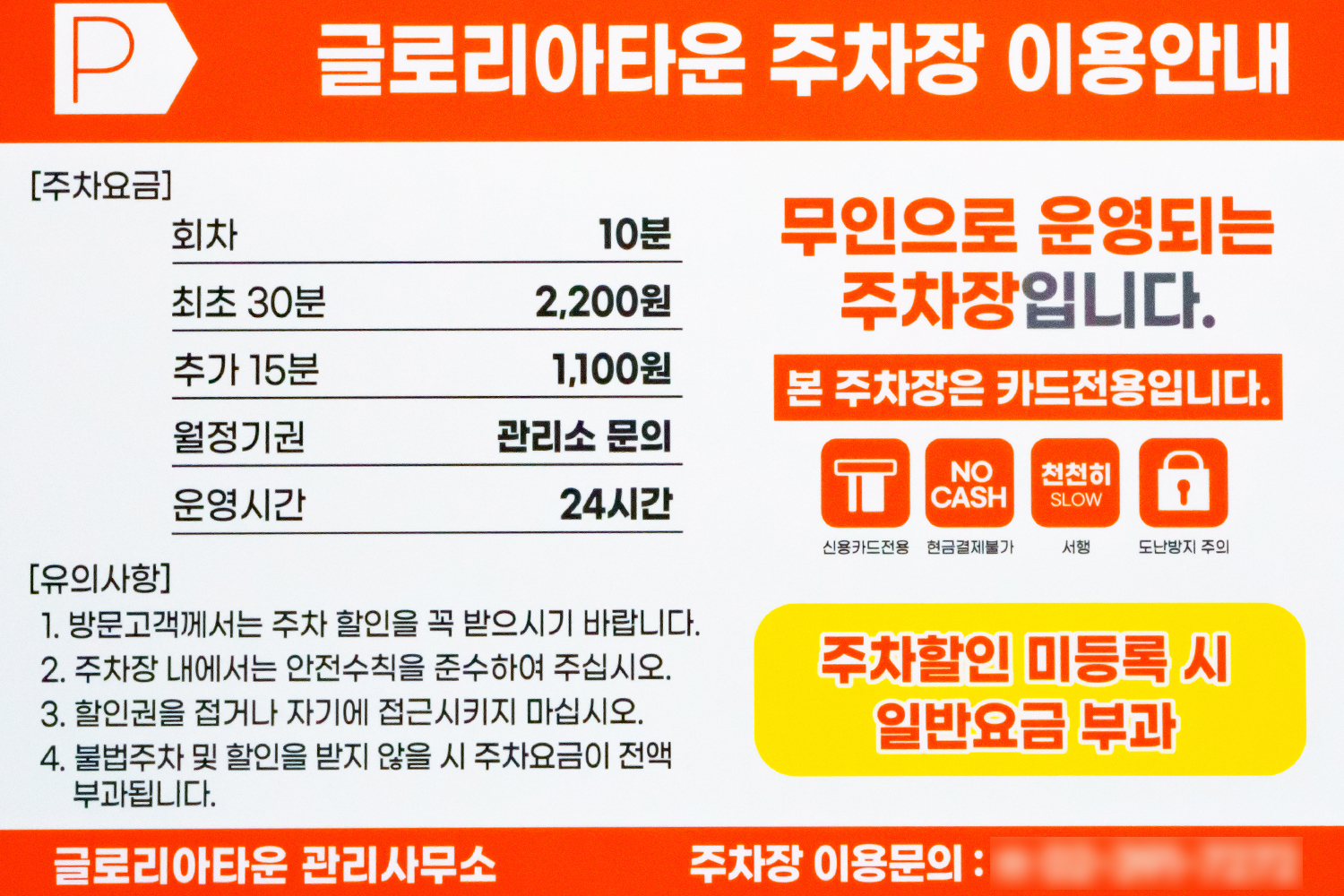 주차요금과 유의사항이 자세히 적혀있어 주차장을 이용하는데 불편함이 없습니다.