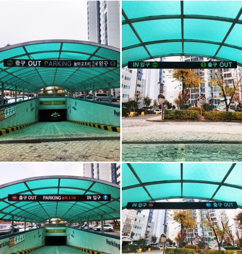입구, 주차장 입구, 주차장 입출구, 유도 안내판들은 요청하셨던 대로