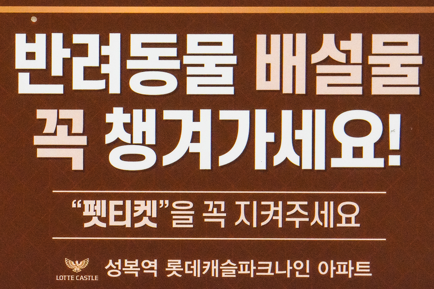 성복역 롯데캐슬 파크나인 에서 주문해 주신 반려동물 배설물 꼭 챙겨가세요 말뚝 안내판입니다.