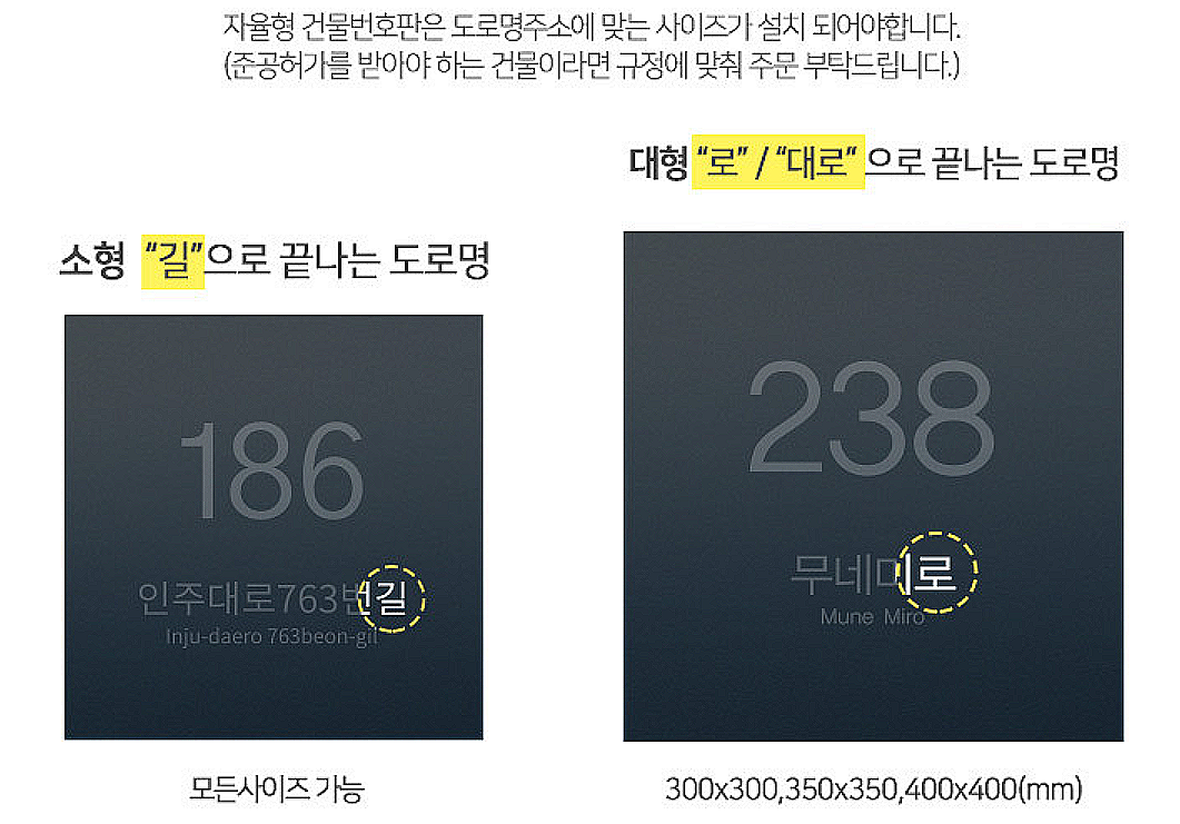 자율형 건물 번호판은 도로명 주소에 맞는 사이즈가 설치가 되어야 합니다.