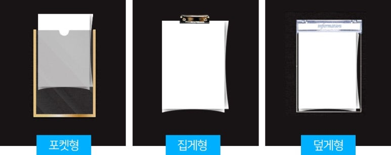 포켓형 / 집게형 / 덮개형 총 3가지 타입의 게시판을 제작할 수 있습니다~!